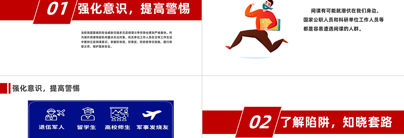 教育機(jī)關(guān)單位工作人員防范間諜行為須知當(dāng)前我國(guó)面臨的安全威脅日趨多元反間諜斗爭(zhēng)形勢(shì)也更加嚴(yán)峻復(fù)雜。作為境外間諜情報(bào)機(jī)構(gòu)重點(diǎn)關(guān)注對(duì)象,機(jī)關(guān)單位工作人員在日常工作生活中要樹(shù)立反間諜意識(shí),掌握防滲透、防策反、防竊密常識(shí)技能,履行保密義務(wù),維護(hù)國(guó)家安全。反間諜教育模板.反間諜主講人:工圖網(wǎng)