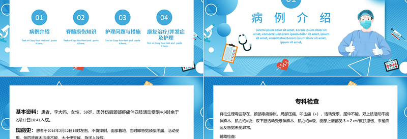 目錄01020304病例介紹Text or Copy Your text and paste it here. 脊髓損傷知識Text or Copy Your text and paste it here. 護理問題與措施Text or Copy Your text and paste it here. 康復(fù)治療/并發(fā)癥及護理Text or Copy Your text and paste it here.