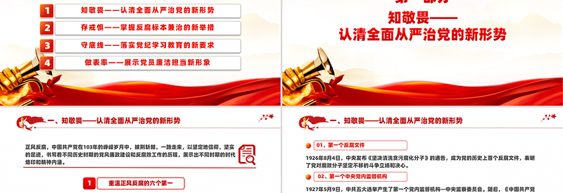 一、知敬畏——認(rèn)清全面從嚴(yán)治黨的新形勢(shì)正風(fēng)反腐,中國(guó)共產(chǎn)黨在103年的崢嶸歲月中,披荊斬棘,一路走來(lái),以堅(jiān)定地信仰,堅(jiān)實(shí)的足跡,書(shū)寫(xiě)著不同歷史時(shí)期的黨風(fēng)廉政建設(shè)和反腐敗工作的歷程,展示出不同時(shí)期的時(shí)代烙印和精神內(nèi)涵。01、第一個(gè)反腐文件02、第一個(gè)中央黨內(nèi)監(jiān)督機(jī)構(gòu)03、第一個(gè)反腐法令04、第一次提出建立廉潔政府的施政綱領(lǐng)05、新中國(guó)第一反腐大案06、改革開(kāi)放反腐第一案