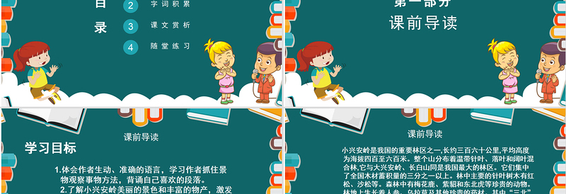 課前導(dǎo)讀學(xué)習(xí)目標(biāo) 1.體會作者生動、準(zhǔn)確的語言,學(xué)習(xí)作者抓住景物觀察事物方法,背誦自己喜歡的段落。2.了解小興安嶺美麗的景色和豐富的物產(chǎn),激發(fā)同學(xué)們熱愛祖國大好河山的思想感情。