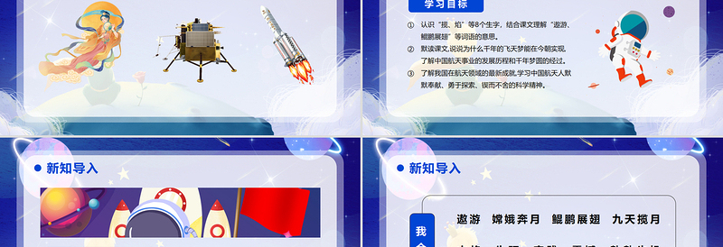 認(rèn)識(shí)“攬、焰”等8個(gè)生字,結(jié)合課文理解“遨游、鯤鵬展翅”等詞語(yǔ)的意思。 默讀課文,說(shuō)說(shuō)為什么千年的飛天夢(mèng)能在今朝實(shí)現(xiàn),了解中國(guó)航天事業(yè)的發(fā)展歷程和千年夢(mèng)圓的經(jīng)過(guò)。 了解我國(guó)在航天領(lǐng)域的最新成就,學(xué)習(xí)中國(guó)航天人默默奉獻(xiàn)、勇于探索、鍥而不舍的科學(xué)精神。新知導(dǎo)入