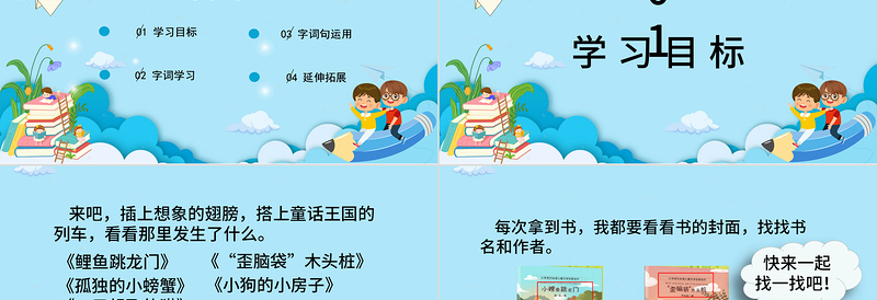 來吧,插上想象的翅膀,搭上童話王國的列車,看看那里發(fā)生了什么?!丁巴崮X袋”木頭樁》《鯉魚跳龍門》《小狗的小房子》《孤獨的小螃蟹》《一只想飛的貓》 看到這些書名,你想知道故事中的主人公有怎樣的奇遇嗎?先猜猜看,再打開童話故事書,我們一起來讀一讀。