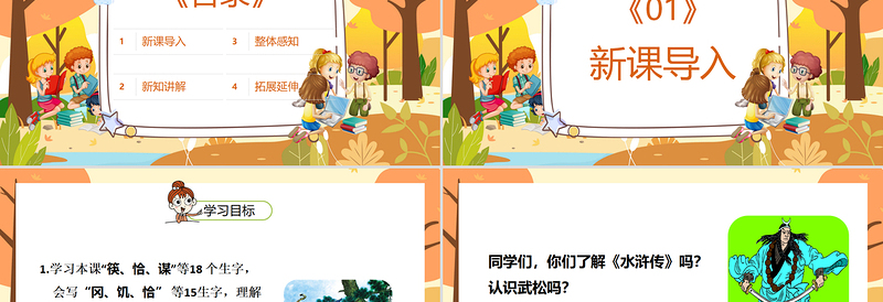 人教部編版五年級下冊語文PPT模板景陽岡匯報(bào)人:辦圖網(wǎng) 時(shí)間:2022-08-04Click here to enter your text and change the color or size of the text. Insert the data text icon, change the picture, and have a good time.contents