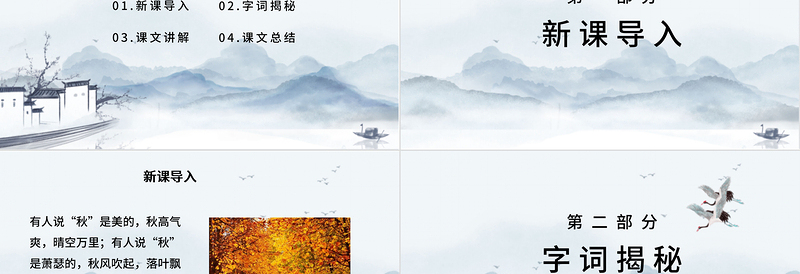 新課導(dǎo)入有人說(shuō)“秋”是美的,秋高氣爽,晴空萬(wàn)里;有人說(shuō)“秋”是蕭瑟的,秋風(fēng)吹起,落葉飄零。不同的人,不同的心情對(duì)相同的景物有不同的感受。在你眼中秋天是怎樣的呢?