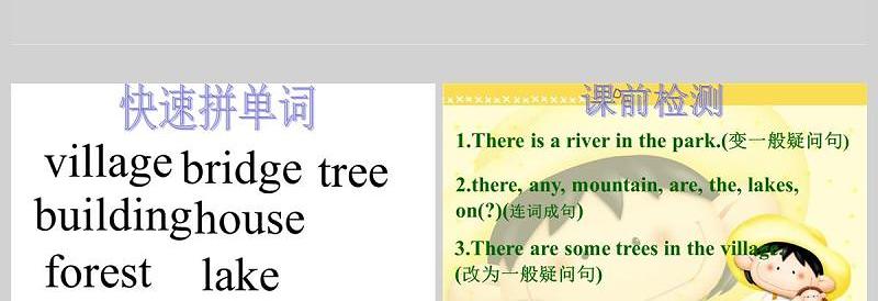 課前檢測(cè)1.There is a river in the park.(變一般疑問(wèn)句)2.there, any, mountain, are, the, lakes, on(?)(連詞成句)3.There are some trees in the village. (改為一般疑問(wèn)句)4.There is a village near the mountain. (改為否定句)