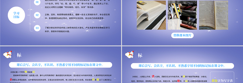 讀大聲讀兩遍,再次標出不認識的字,不理解的詞句。20世紀是一個呼風喚雨的世紀。是誰來呼風喚雨呢?當然是人類??渴裁春麸L喚雨呢?靠的是現(xiàn)代科學技術(shù)。在20世紀100年的時間里,人類利用現(xiàn)代科學技術(shù)獲得那么多奇跡般的、出乎意料的發(fā)現(xiàn)和發(fā)明。正是這些發(fā)現(xiàn)和發(fā)明,使人類的生活大大改觀,其改變的程度超過了人類歷史上百萬年的總和。人類在上百萬年的歷史中一直很依賴自然,生活在一個慢吞吞、靜悄悄、一到夜里就黑暗無光的世界。那時沒有電燈,沒有電視,沒有收音機,也沒有汽車。人們只能在神話中用“千里眼”“順風耳”和騰云駕霧的神仙,來寄托自己的美好愿望。我們的祖先大概誰也沒有料到,在最近的100年中,他們的那么多幻想紛紛變成了現(xiàn)實。20世紀的成就,真可以用“忽如一夜春風來,千樹萬樹梨花開”來形容。