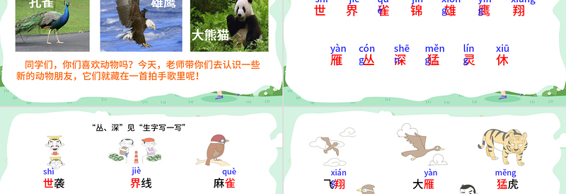 生字認一認世shì界jiè雀què錦jǐn雄xióng鷹yīng翔xiáng雁yàn深měng靈líng休xiū叢猛cóngshēn