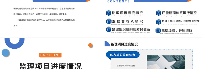 監(jiān)理項(xiàng)目進(jìn)度情況Never forget what you are, for surely the world will not. Make it your strength. Never forget what you are, for surely the world will not. surely the01PART ONE
