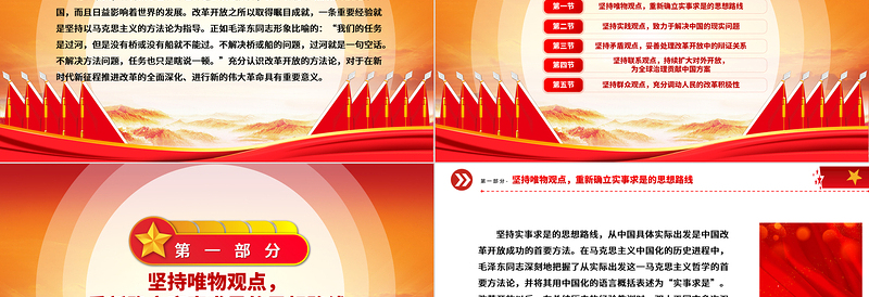 目錄 /Mu Lu第一節(jié)堅(jiān)持唯物觀點(diǎn),重新確立實(shí)事求是的思想路線第二節(jié)堅(jiān)持實(shí)踐觀點(diǎn),致力于解決中國的現(xiàn)實(shí)問題 第三節(jié)堅(jiān)持矛盾觀點(diǎn),妥善處理改革開放中的辯證關(guān)系第四節(jié)堅(jiān)持聯(lián)系觀點(diǎn),持續(xù)擴(kuò)大對外開放, 為全球治理貢獻(xiàn)中國方案第五節(jié)堅(jiān)持群眾觀點(diǎn),充分調(diào)動人民的改革積極性