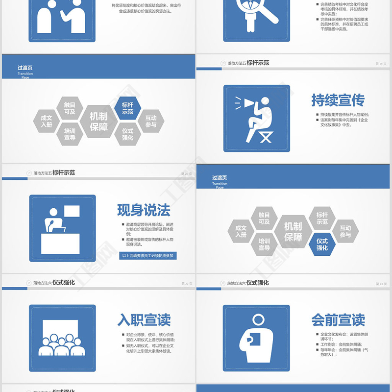 落地方法五 標(biāo)桿示范持續(xù)宣傳持續(xù)搜集并宣傳標(biāo)桿人物案例;該案例每年集中完善到《企業(yè)文化故事集》中去。