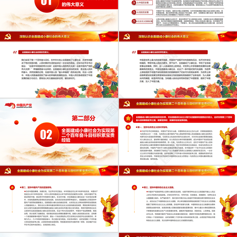 深刻認識全面建成小康社會的偉大意義在中華大地上全面建成小康社會,是我們黨百年奮斗的偉大成就,中國共產(chǎn)黨兌現(xiàn)了向中國人民的鄭重承諾,向歷史、向世界交出了一份優(yōu)異答卷。全面建成小康社會的歷史性意義。01從中國歷史看從黨的歷史看實現(xiàn)小康是中華民族千年追求的夢想。在歷朝歷代封建專制統(tǒng)治下的中國人民和近代以來處于半殖民地半封建社會中的中國人民而言,實現(xiàn)溫飽是遙不可及的愿望。如今,中國共產(chǎn)黨帶領(lǐng)中國人民全面建成小康社會,歷史性地解決了絕對貧困問題,使老百姓過上了過去想不到的美好生活,這在中國歷史上是首次。中國共產(chǎn)黨一經(jīng)誕生,就把為中國人民謀幸福、為中華民族謀復(fù)興確立為自己的初心使命。百年輝煌歷程,我們黨帶領(lǐng)中國人民創(chuàng)造了偉大成就,其中,全面建成小康社會這一重大歷史事件再次向歷史和人民鄭重昭示了黨的初心與使命。從社會主義發(fā)展史看讓絕大多數(shù)人翻身過上好日子,是全世界共產(chǎn)主義者的奮斗初衷,也是各社會主義國家的發(fā)展目標。但只有中國真正克服種種困難、戰(zhàn)勝種種挑戰(zhàn),帶領(lǐng)人民走進小康社會。在中國共產(chǎn)黨領(lǐng)導(dǎo)下,社會主義中國接續(xù)努力、不斷奮斗,使人民從極其貧困落后走向全面小康,這對全世界社會主義運動具有標桿性意義。