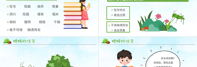住宅特點(diǎn) 建造過程 通過上節(jié)課的學(xué)習(xí),蟋蟀是從哪兩個方面介紹蟋蟀的住宅的?我們了解了蟋蟀有什么特點(diǎn)?不肯隨遇而安 選址慎重