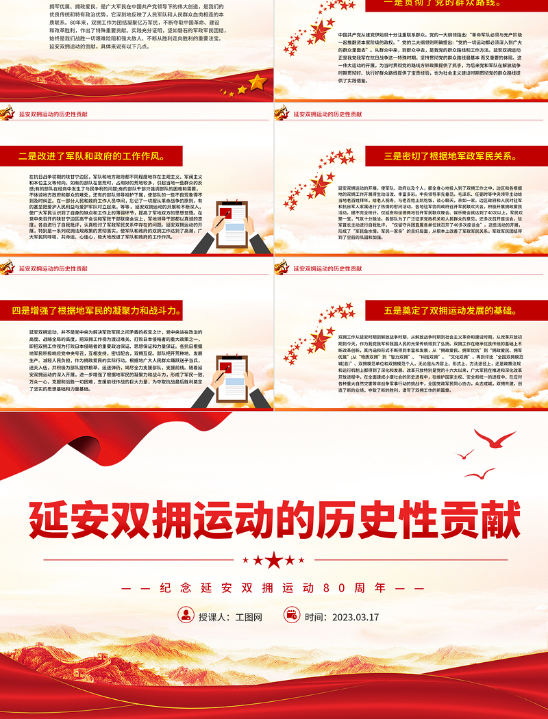 工圖網(wǎng)提供2023延安雙擁運動的歷史性貢獻PPT紅色大氣紀(jì)念延安雙擁運動80周年專題黨課課件供會員免費下載。更多精彩黨課PPT素材,盡在工圖網(wǎng)。