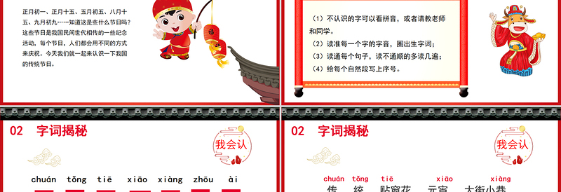 正月初一、正月十五、五月初五、八月十五、九月初九……知道這是些什么節(jié)日嗎?這些節(jié)日是我國民間世代相傳的一些紀念活動,每個節(jié)日,人們都會用不同的方式來慶祝。今天我們就一起來認識一下我國的傳統(tǒng)節(jié)日。01 課前導(dǎo)讀