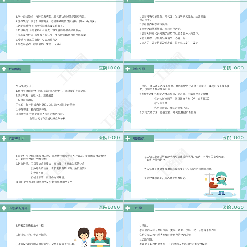醫(yī)院LOGO護(hù)理診斷1.氣體交換受損 與肺組織病變,肺氣管功能降低等因素有關(guān)。2.營養(yǎng)失調(diào):低于機(jī)體需要量 與癌腫致機(jī)體過度消耗,攝入不足有關(guān) 。3.活動(dòng)無耐力 與患者長期臥床及貧血有關(guān)。4.知識(shí)缺乏 與患者的文化程度、不了解肺癌相關(guān)知識(shí)有關(guān)5.有感染的危險(xiǎn) 與患者長期臥床,未及時(shí)更換體位和貧血有關(guān)6.恐懼 與肺癌的確診、咯血加重有關(guān)7.潛在并發(fā)癥:呼吸衰竭,窒息,大咯血