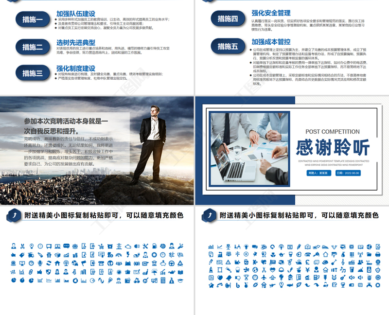 五項工作措施隊伍建設(shè)安全管理樹立標(biāo)桿成本管控制度建設(shè)工作目標(biāo)如果我能在此次競聘中脫穎而出,走上某某崗位,我將緊緊圍繞公司的中心工作,在黨務(wù)建設(shè)、隊伍建設(shè)、制度建設(shè)、安全管理、成本管控五個方面來提高工作質(zhì)量,為公司發(fā)展做出積極貢獻(xiàn)。