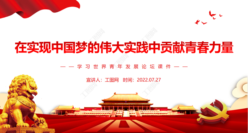 ——學(xué)習(xí)世界青年發(fā)展論壇課件——宣講人:工圖網(wǎng) 時(shí)間:2022.07.27在實(shí)現(xiàn)中國(guó)夢(mèng)的偉大實(shí)踐中貢獻(xiàn)青春力量