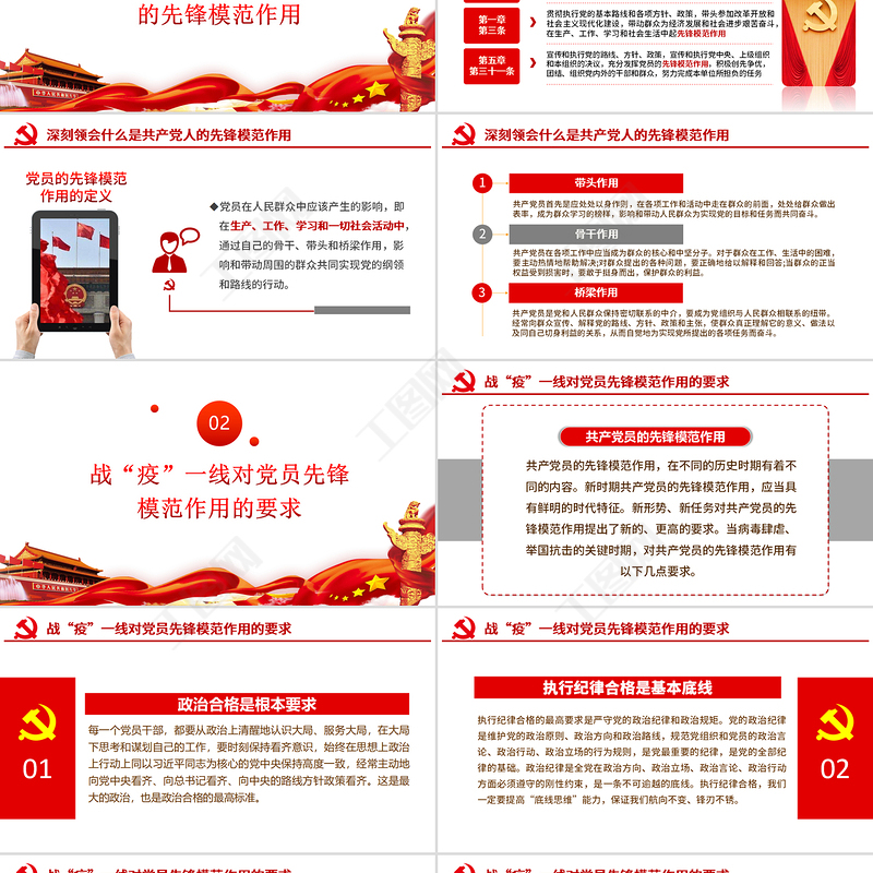深刻領(lǐng)會什么是共產(chǎn)黨人的先鋒模范作用黨章中共三次提到黨員的先鋒模范作用黨必須實行民主的科學(xué)的決策,制定和執(zhí)行正確的路線、方針、政策,做好黨的組織工作和宣傳教育工作,發(fā)揮全體黨員的先鋒模范作用總綱中指出貫徹執(zhí)行黨的基本路線和各項方針、政策,帶頭參加改革開放和社會主義現(xiàn)代化建設(shè),帶動群眾為經(jīng)濟發(fā)展和社會進步艱苦奮斗,在生產(chǎn)、工作、學(xué)習(xí)和社會生活中起先鋒模范作用第一章第三條宣傳和執(zhí)行黨的路線、方針、政策,宣傳和執(zhí)行黨中央、上級組織和本組織的決議,充分發(fā)揮黨員的先鋒模范作用,積極創(chuàng)先爭優(yōu),團結(jié)、組織黨內(nèi)外的干部和群眾,努力完成本單位所擔(dān)負的任務(wù)第五章第三十一條