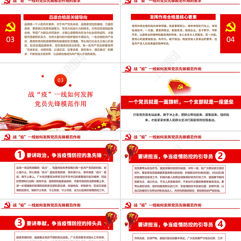 戰(zhàn)“疫”一線對黨員先鋒模范作用的要求品德合格是關(guān)鍵導(dǎo)向品德是一個人的內(nèi)在素養(yǎng),對于共產(chǎn)黨員來說,品德是黨性的基礎(chǔ)、力量的源泉,更是我們黨具有凝聚力、號召力和戰(zhàn)斗力的根本。只有黨員做到品德合格,帶領(lǐng)廣大群眾共同進步,才能讓道德高尚在當(dāng)今社會蔚然成風(fēng),才能提升國家的軟實力,為偉大復(fù)興的中國夢提供不竭動力。一名合格的共產(chǎn)黨員,要具有高尚的道德情操和健康的生活情趣,帶頭踐行社會主義核心價值觀,自覺加強品德修養(yǎng)、黨性鍛煉和政治歷練。每一名共產(chǎn)黨員都要按照“忠誠老實、光明坦蕩、公道正派、實事求是、艱苦奮斗、清正廉潔”的要求,不斷改造主觀世界,讓品德合格成為共產(chǎn)黨人不變的底色。