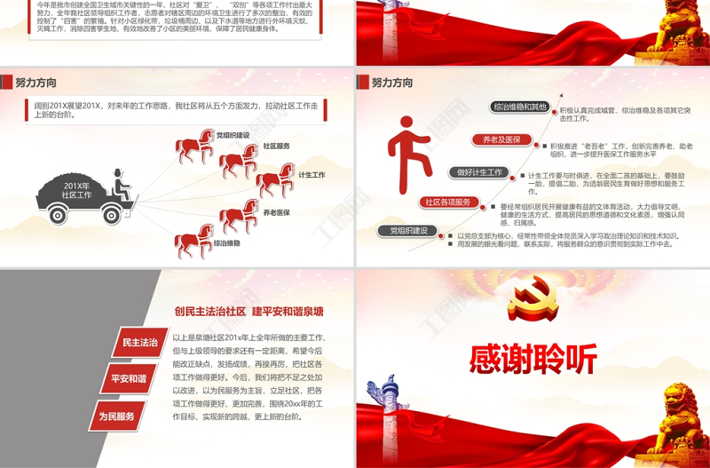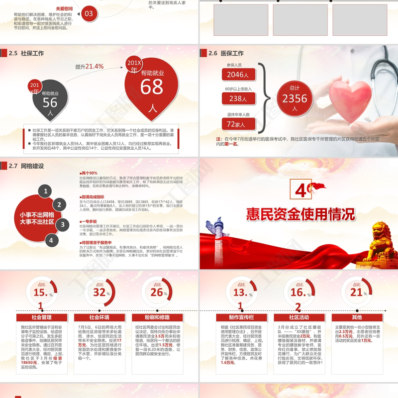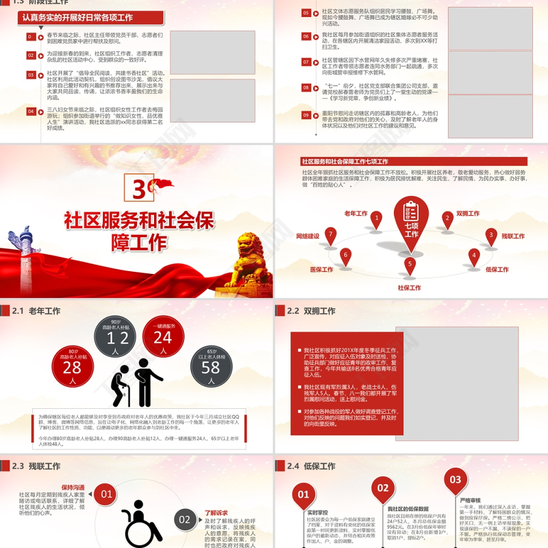 <p>20XX年基層村鄉(xiāng)鎮(zhèn)社區(qū)辦事處工作匯報適用于村、社區(qū)等基層組織用于創(chuàng)評,民主法治等各項工作匯報,易于改造</p><br><p>前言 20XX年,我社區(qū)在街道黨工委、辦事處的領(lǐng)導(dǎo)下,認(rèn)真貫徹落實黨的十九大精神,以“科學(xué)發(fā)展、和諧發(fā)展、跨越發(fā)展”為主題,全面加強社區(qū)黨組織的建設(shè),切實發(fā)揮基層黨組織的戰(zhàn)斗堡壘作用,為居民群眾提供優(yōu)質(zhì)服務(wù),為民辦實事、辦好事,讓居民群眾在社區(qū)建設(shè)中得實惠。同時圍繞本社區(qū)中心扎實有效的開展好各項工作,較好地完成了年初制定的各項工作目標(biāo),使各項工作都取得了優(yōu)良的成績。回顧一年來的工作實踐,現(xiàn)總結(jié)匯報如下:</p><br><p>目錄010203040506</p><br><p>1社區(qū)概況簡介</p><br><p>1.1 社區(qū)概況泉塘社區(qū)南起鳳臺南路、北止賽虹橋,東起寧蕪鐵路、西止南河。轄區(qū)占地面積約1.1平方公里。社區(qū)黨總支部是2003年6月成立的,截止當(dāng)前共有黨員190人,下設(shè)集合、西營村、賽虹橋三個黨支部。社區(qū)黨總支書記1名、副書記2名。主任1名、副主任1名、委員4名。 </p><br><p>1.2 數(shù)字泉塘社區(qū)共有樓房42幢,下設(shè)30個居民小組,常住人口2160戶,5598人。其中空掛449人。黨支部由5名委員組成,下轄3個黨支部,12個黨小組,315名黨員。社區(qū)共有工作人員17人,42個樓長,2個片區(qū),14個網(wǎng)絡(luò)。流動人口1207人,出租戶30戶,駐地單位6戶。55983171207人個人人</p><br><p>2社區(qū)黨建工作</p><br><p>文明創(chuàng)建工作階段性工作黨務(wù)工作社區(qū)黨建工作主要有三個方面</p><br><p>社區(qū)黨支部落實組織實施基層黨建工作三級“聯(lián)述聯(lián)評聯(lián)考”制度。狠抓黨員的“保先教育” ,把“學(xué)習(xí)貫徹十八大,建功立業(yè)在中南”、“三會一課”、“結(jié)對共建”、 “讀書之城”等主題實踐活動當(dāng)作有效載體。進一步完善各項工作,同時也強調(diào)任何工作都要做到:“有計劃、有措施、有活動、有記錄、有總結(jié)”。兩學(xué)一做聯(lián)述聯(lián)評聯(lián)考今年的社區(qū)黨建各項工作活動都是圍繞學(xué)習(xí)貫徹“兩學(xué)一做”為主線。為了更好地開展學(xué)習(xí)“兩學(xué)一做”活動,我們對學(xué)習(xí)活動制定了計劃,召開了動員大會,支部學(xué)習(xí)專題討論小組會議。不斷學(xué)習(xí)提高了兩委成員專業(yè)技術(shù)知識,并按計劃認(rèn)真展開學(xué)習(xí)黨的方針政策及法律法規(guī),增強了兩委成員的服務(wù)意識、執(zhí)政能力及業(yè)務(wù)素質(zhì)。1.1 黨務(wù)工作</p><br><p>1.1 黨務(wù)工作發(fā)揮核心引領(lǐng)作用今年是是深化社區(qū)建設(shè)的重要一年,社區(qū)支部將深入學(xué)習(xí)貫徹十八大精神,進一步加強社區(qū)管理和社區(qū)建設(shè),作為貫穿全年的首要政治任務(wù)。年初召開懇談會,與居民群眾們一起探討社區(qū)來年的規(guī)劃、發(fā)展建議。對居民群眾提出的議案和意見我們都做好記錄和處理,對該幫扶的我們也及時聯(lián)系幫扶。堅持黨員“三會一課”制度,今年召開黨員大會、舉辦黨課講座14場,組織各類活動16次,增強了黨員的黨性和覺悟。通過開展黨員“五個一”活動(當(dāng)好一名聯(lián)絡(luò)員,帶好一幢居民樓,幫好一家困難戶,出好一個金點子,辦好一件社區(qū)事),鼓勵黨員加入到社區(qū)志愿者服務(wù)中來,社區(qū)黨組織在社區(qū)工作的核心領(lǐng)導(dǎo)作用得以彰顯。每季度把黨務(wù)、居務(wù)、財務(wù)的情況進行公開公示,積極接受居民群眾們的監(jiān)督。</p><br><p>1.2 文明創(chuàng)建工作廣泛開展思想道德教育和學(xué)習(xí)宣傳道德模范社區(qū)定期舉辦道德講堂活動。積極參加街道及友鄰社區(qū)組織的道德講堂活動,真誠地希望通過每一次活動的開展,都能使我們每一個人心靈得到洗滌、凈化,感悟道德,成為道德的傳播者,踐行者和受益者。大力推進未成年人思想道德建設(shè)認(rèn)真落實《全國未成年人思想道德建設(shè)測評體系》目標(biāo)任務(wù)。按照《測評體系》,分解目標(biāo)任務(wù),明確工作職責(zé),強化領(lǐng)導(dǎo)體制。凈化未成年人成長的社會文化環(huán)境,促進未成年人健康成長的精神,為未成年人成長營造良好社會文化環(huán)境。開展“我們的節(jié)日”主題文化活動在春節(jié)、清明、端午、中秋、重陽等傳統(tǒng)節(jié)日期間,組織黨員干部、志愿者們開展群眾性文化活動、志愿服務(wù)活動,弘揚中華優(yōu)秀傳統(tǒng)文化,踐行服務(wù)主題實踐活動。文明創(chuàng)建工作</p><br><p>1.3 階段性工作春節(jié)來臨之際,社區(qū)主任帶領(lǐng)黨員干部、志愿者們到困難黨員家中進行幫扶及慰問。認(rèn)真務(wù)實的開展好日常各項工作0 1為迎接新春的到來,社區(qū)組織工作者、志愿者清理雜亂的社區(qū)活動中心,受到群眾的一致好評。02社區(qū)開展了“倡導(dǎo)全民閱讀、共建書香社區(qū)”活動。社區(qū)利用此活動契機,組織創(chuàng)設(shè)圖書沙龍,倡議大家將自己愛好和有興趣的書推薦出來、展示出來與大家共同品讀、傳誦,讓濃濃書香豐盈我們的生命內(nèi)涵。03三八婦女節(jié)來臨之際,社區(qū)