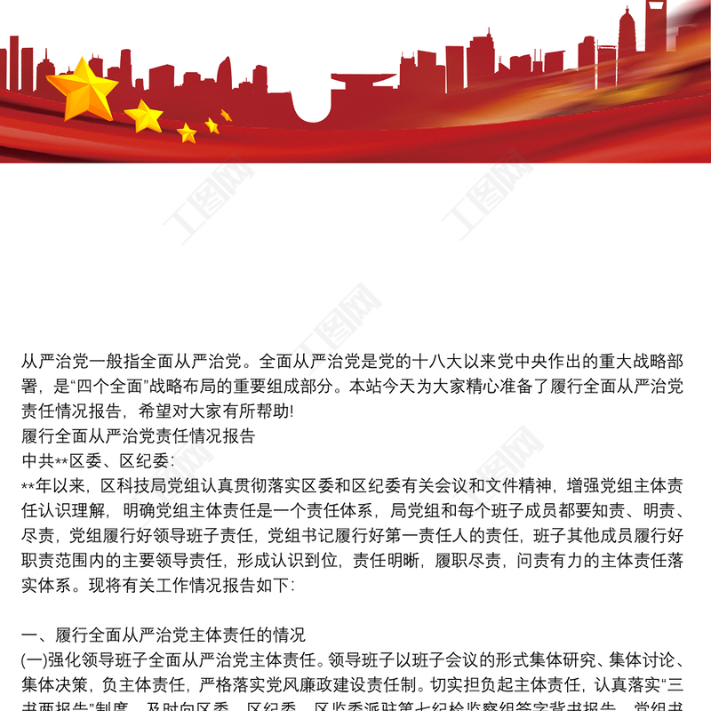 工圖網(wǎng)提供履行全面從嚴(yán)治黨責(zé)任情況報告供會員免費(fèi)下載。更多精彩黨課PPT素材,盡在工圖網(wǎng)。