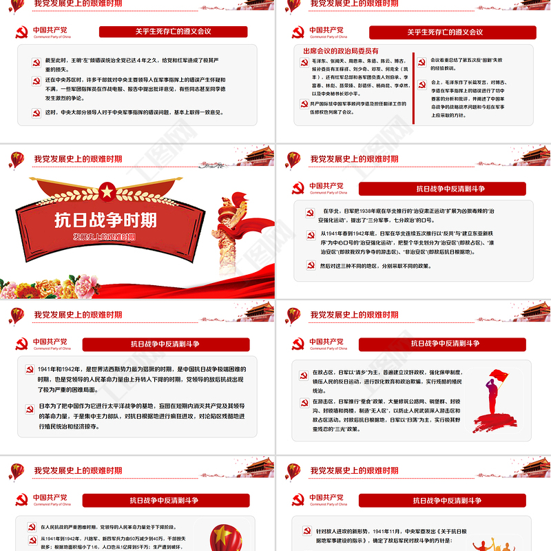 我黨發(fā)展史上的艱難時期中國共產(chǎn)黨Communist Party of China抗日戰(zhàn)爭中反清剿斗爭在敵占區(qū),日軍以“清鄉(xiāng)”為主,普遍建立漢奸政權(quán),強(qiáng)化保甲制度,鎮(zhèn)壓人民的反日運(yùn)動,進(jìn)行奴化教育和政治欺騙,實行殘酷的殖民統(tǒng)治。在游擊區(qū),日軍推行“蠶食”政策,大量修筑公路網(wǎng)、碉堡群、封鎖溝、封鎖墻和崗樓,制造“無人區(qū)”,以防止人民武裝深入游擊區(qū)和敵占區(qū)活動。對敵后抗日根據(jù)地,日軍以“掃蕩”為主,實行極其野蠻殘忍的“三光”政策。
