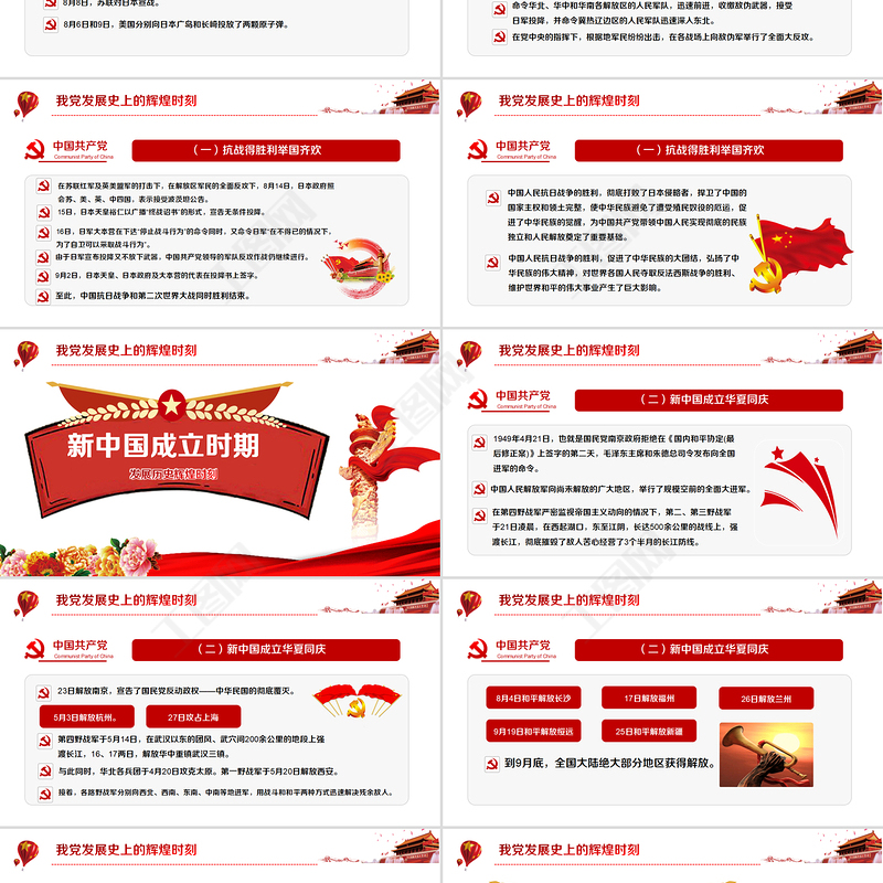 我黨發(fā)展史上的輝煌時刻中國共產(chǎn)黨Communist Party of China到9月底,全國大陸絕大部分地區(qū)獲得解放。8月4日和平解放長沙17日解放福州26日解放蘭州9月19日和平解放綏遠(yuǎn)25日和平解放新疆(二)新中國成立華夏同慶