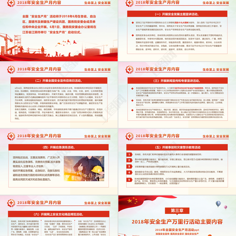2018年安全生產(chǎn)月的總體思路以新時代中國特色社會主義思想為指導(dǎo),深入宣傳貫徹黨的十九大精神、關(guān)于安全生產(chǎn)工作的重要思想和黨中央、國務(wù)院關(guān)于安全生產(chǎn)工作的決策部署以強(qiáng)化安全紅線意識、落實安全責(zé)任、推進(jìn)依法治理、深化專項整治、深化改革創(chuàng)新等為重點內(nèi)容以“生命至上、安全發(fā)展”為主題,以增強(qiáng)全民應(yīng)急意識,提升公眾安全素質(zhì),提高防災(zāi)減災(zāi)救災(zāi)能力,遏制重特大安全事故為目標(biāo)開展政治性、專業(yè)性、文藝性、新聞性有機(jī)結(jié)合、富有實效的宣傳教育活動切實推動安全文化進(jìn)企業(yè)、進(jìn)學(xué)校、進(jìn)機(jī)關(guān)、進(jìn)社區(qū)、進(jìn)農(nóng)村、進(jìn)家庭、進(jìn)公共場所,為促進(jìn)安全生產(chǎn)形勢持續(xù)穩(wěn)定好轉(zhuǎn),全面建成小康社會貢獻(xiàn)力量。4舉措和預(yù)想效果2具體目標(biāo)指導(dǎo)思想1重點內(nèi)容3