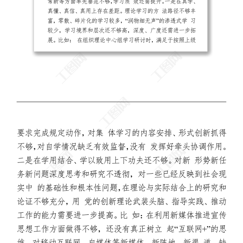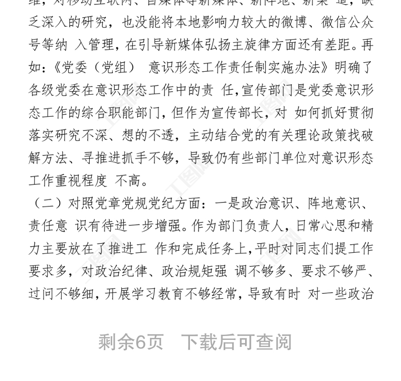 工圖網(wǎng)提供2021黨史學(xué)習(xí)教育專題民主生活會(huì)個(gè)人對(duì)照檢查材料(宣傳部長(zhǎng))供會(huì)員免費(fèi)下載。更多精彩黨課PPT素材,盡在工圖網(wǎng)。