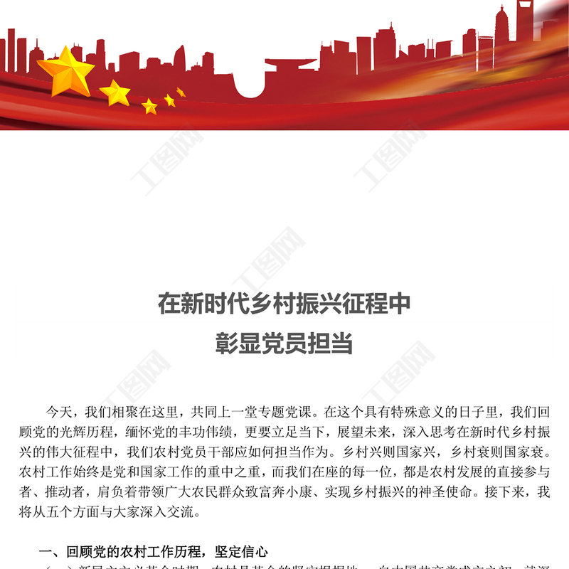 工圖網(wǎng)提供在新時代鄉(xiāng)村振興征程中彰顯黨員擔(dān)當(dāng)PPT黨課課件(講稿)供會員免費下載。更多精彩黨課PPT素材,盡在工圖網(wǎng)。