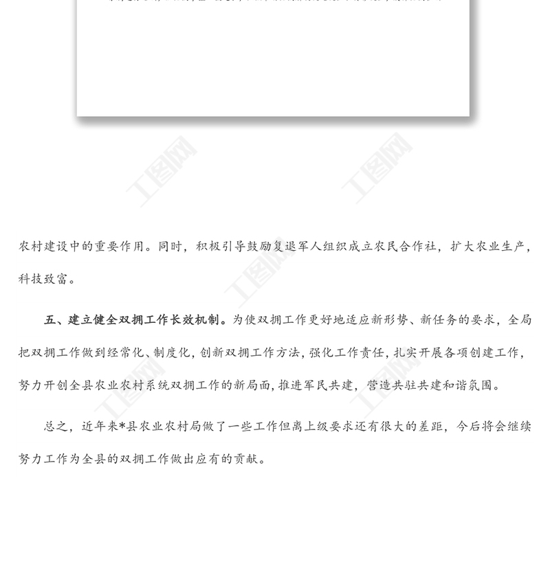 工圖網(wǎng)提供縣農(nóng)業(yè)農(nóng)村局雙擁工作匯報材料供會員免費(fèi)下載。更多精彩黨課PPT素材,盡在工圖網(wǎng)。