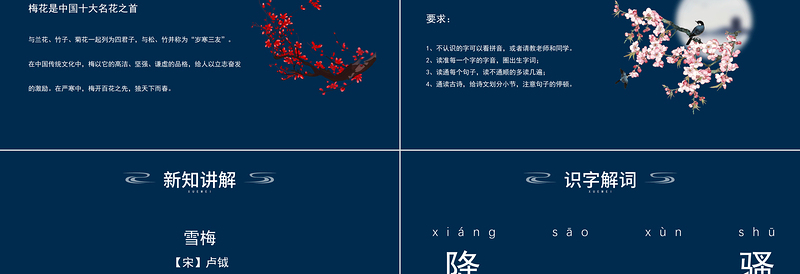 新知導(dǎo)入XUEMEI梅花是中國(guó)十大名花之首與蘭花、竹子、菊花一起列為四君子,與松、竹并稱為“歲寒三友”。在中國(guó)傳統(tǒng)文化中,梅以它的高潔、堅(jiān)強(qiáng)、謙虛的品格,給人以立志奮發(fā)的激勵(lì)。在嚴(yán)寒中,梅開百花之先,獨(dú)天下而春。