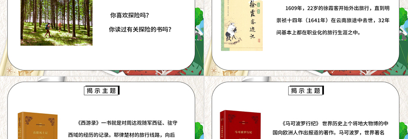 小學(xué)學(xué)科網(wǎng) xuekeedu.com小學(xué)學(xué)科網(wǎng) xuekeedu.com小學(xué)學(xué)科網(wǎng) xuekeedu.com 1609年,22歲的徐霞客開(kāi)始外出旅行,直到明崇禎十四年(1641年)在云南旅途中去世,32年間基本上都在職業(yè)化的旅行生涯之中。揭示主題